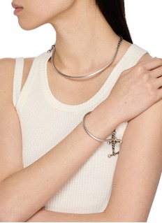 This Ann Demeulemeester bracelet showcases a fusion of rustic charm and modern design. Crafted from high-quality metal, its unique structure features a smooth main band complemented by intricate, twisted accents and spherical details. The secure closure ensures a comfortable fit.