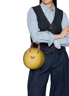 This charming circular crossbody showcases Anya Hindmarch's artisanal craftsmanship with intricate hand-crocheted detailing in concentric patterns and signature bow motif. The compact silhouette features dual leather top handles, a detachable adjustable strap, and contrast stitching for versatile styling. A perfectly proportioned piece that adds whimsical sophistication to day-to-night looks.