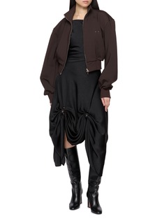 A study in transformation, this dress shifts between fluid and sculptural with its adjustable curtain draping. Designed to be worn two ways, the elongated silhouette is punctuated by gathered details that create soft volume and movement—an expressive piece that transitions seamlessly from understated daywear to directional evening styling.
