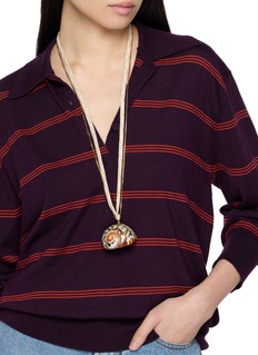 This Dries Van Noten necklace artfully combines rustic charm with a touch of whimsy. The necklace features a unique, intricately patterned shell pendant that lends a natural, earthy vibe. Suspended from a dual-strand cord, one part braided with delicate gold threading, this piece beautifully captures a bohemian aesthetic. The soft, neutral tones of the cord contrast exquisitely with the vibrant details of the shell, making it a standout accessory.