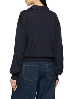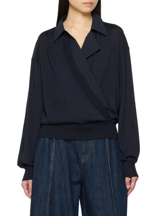 Balancing structure and softness, this long-sleeved knit top reveals a layered, wrap-inspired front that subtly redefines classic shirting codes. Edition refines the silhouette with fluid lines and ribbed trims, ideal for pairing with denim or tailored separates from day to evening.