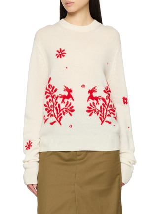 A poetic interplay of softness and symbolism, this long sleeve knit top by Edition is animated with folkloric red floral motifs scattered across a clean base. The classic crew neckline and relaxed proportions lend it quiet versatility—ideal layered under tailoring or worn alone as a statement piece.