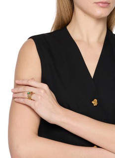 This stacked ring set exemplifies Goossens' artisanal mastery with its trio of stones set in textured gold-toned brass. Each band features uniquely shaped cabochons in a gradiating shade, creating a harmonious palette.