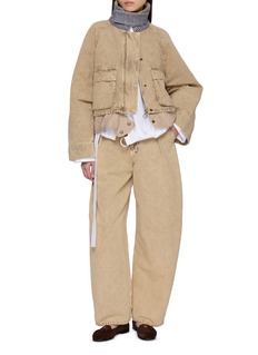 A tactile outer layer shaped by contrast, this jacket from LOEWE fuses acid-washed denim with a softly quilted underlayer. Rugged yet considered, it brings utilitarian attitude to everyday dressing—ideal for transitional weather, layered over knits or styled as a statement set.