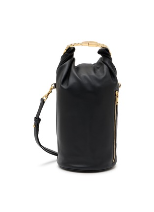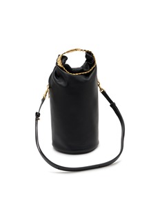 This watch belt bag from sacai stands out with its innovative design, featuring a unique integrated watch strap that wraps around the bag for a bold, functional detail. The sleek black leather and gold-toned hardware add a touch of avant-garde sophistication. A striking fusion of utility and modern style.